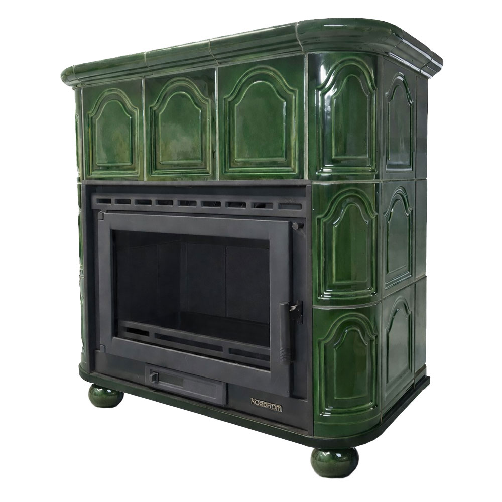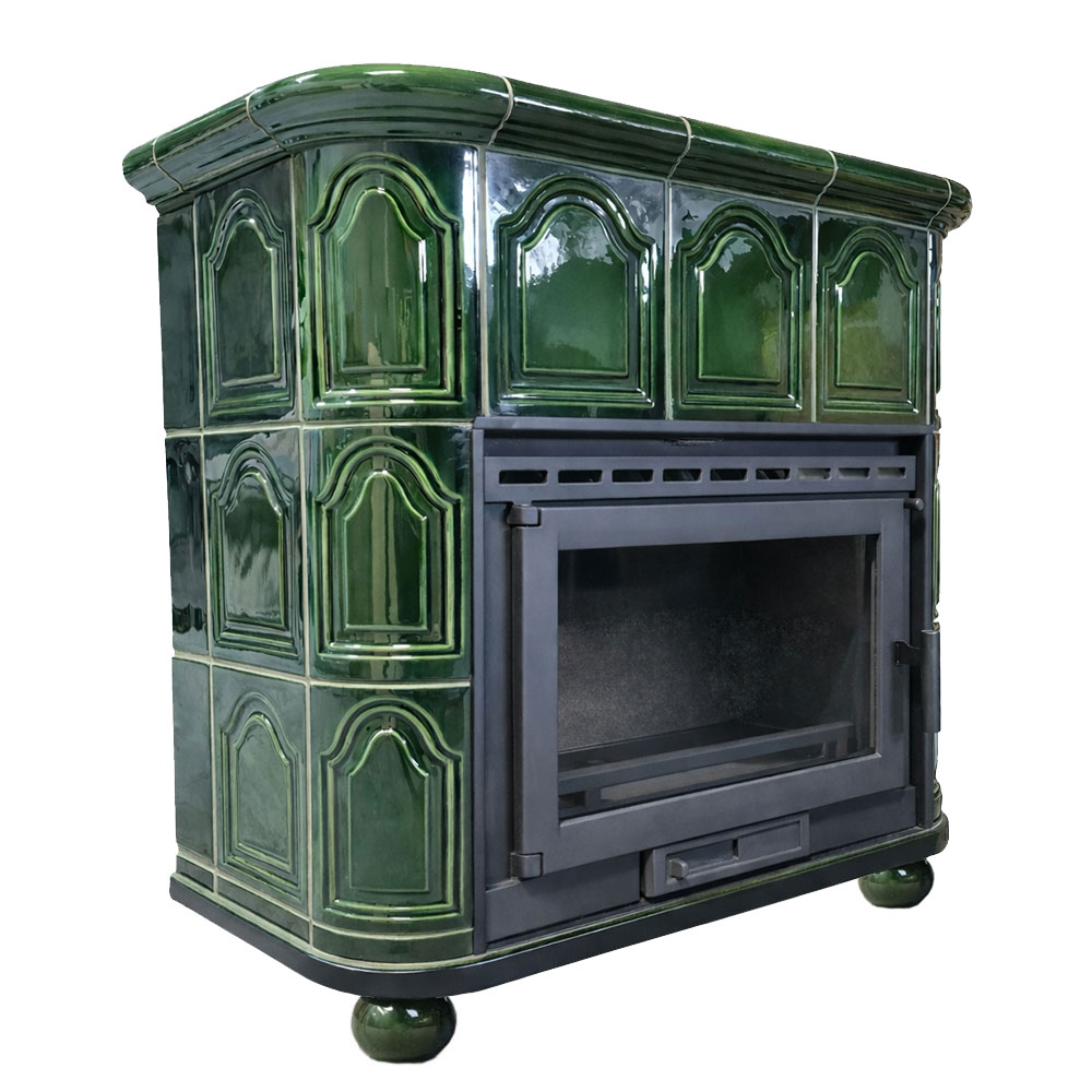 Piec kaflowy z oryginalnych kafli ceramicznych z zawartością szamotu z żeliwnym wkładem o mocy nominalnej 13 kW. Kolor kafla: zielony (butelkowy).