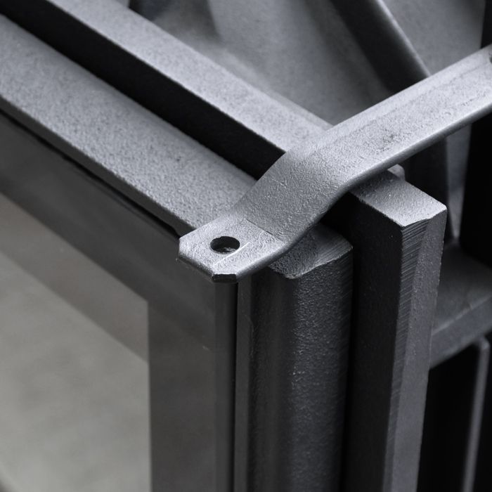Duża szyba z czarnym zdobieniem zapewnia idealną wizję ognia.